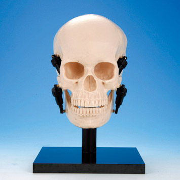 - 4 cylinders representing the temporal and masseter muscles are attached to the skull model